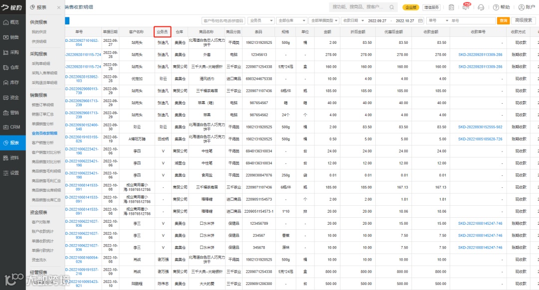01.业务员收款明细,“归属业务员”筛选项文案改为“业务员”