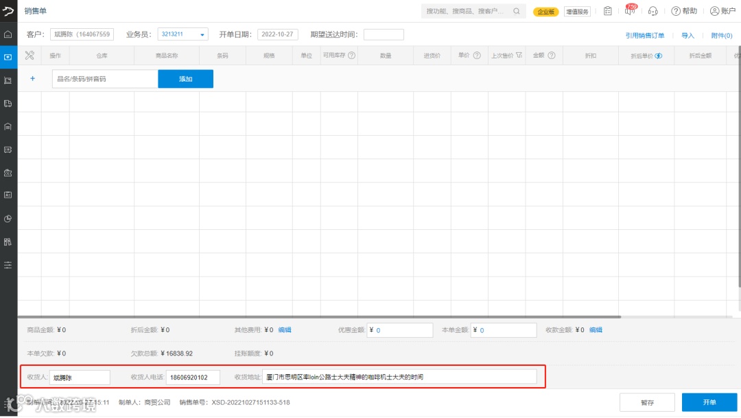 02.销售订单/销售单开单,默认填入收件人信息