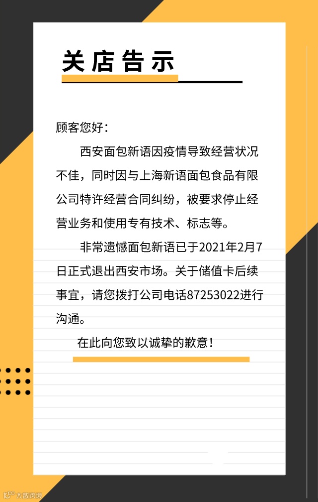 近日,西安面包新语通过其微信公众号发布公告称,因疫情导致经营状况不佳,以及与上海新语面包食品有限公司存在特许经营合同纠纷,已被要求停止经营业务和使用专有技术、标志等。
