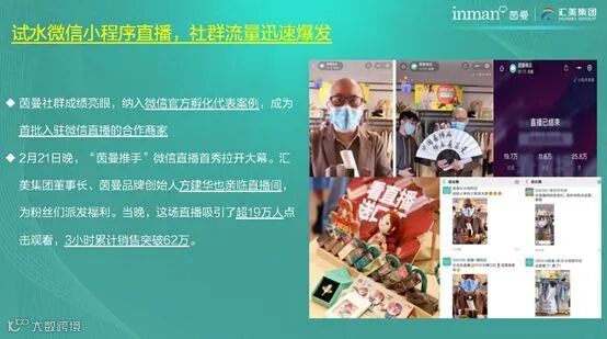 但这时候出现了新问题,在秒杀、网购、社群电商的轰炸之下,顾客对这些没有兴奋点和刺激点了,茵曼开始走了第二步——直播。在库存消耗得差不多的情况下,茵曼的直播从新品开始做起。首先在腾讯试水一个商家,发现社群流量迅速爆发。2月11日的晚上,我们作为茵曼官方孵化的案例,入驻了他们的平台,成为了他们签约合作的第一批商家。当晚我们直播了两个小时,达到超过19万人的观看,两个小时我们突破了62万的销售业绩。