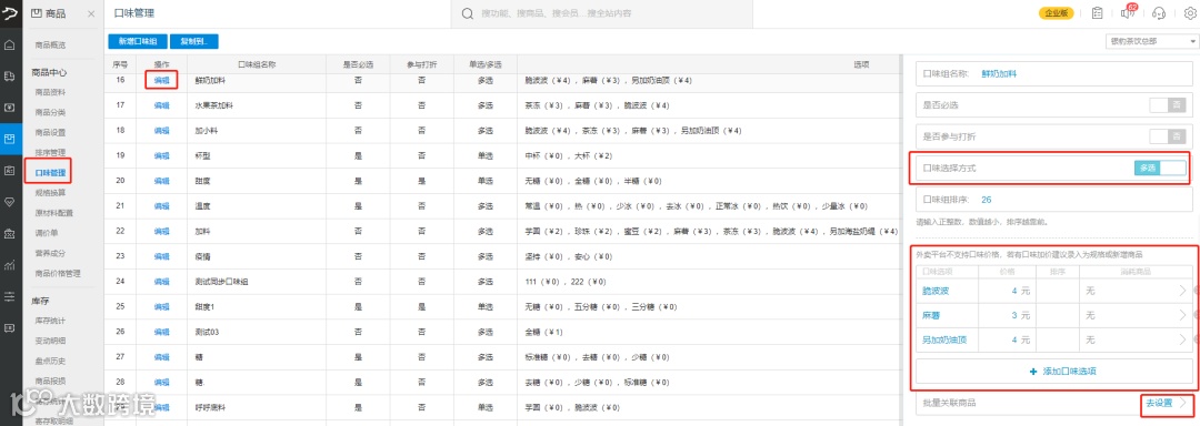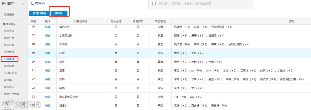 商品模块,新增【口味管理】可以自定义分组,且对口味进行管理。例如,温度:热、常温、冰、去冰等。口味管理方便了小伙伴在新增产品时的繁琐步骤,不再需要一个个商品进行标记,可以复制相对应的口味组,到相对应的商品中,从此不再无薪加班啦~