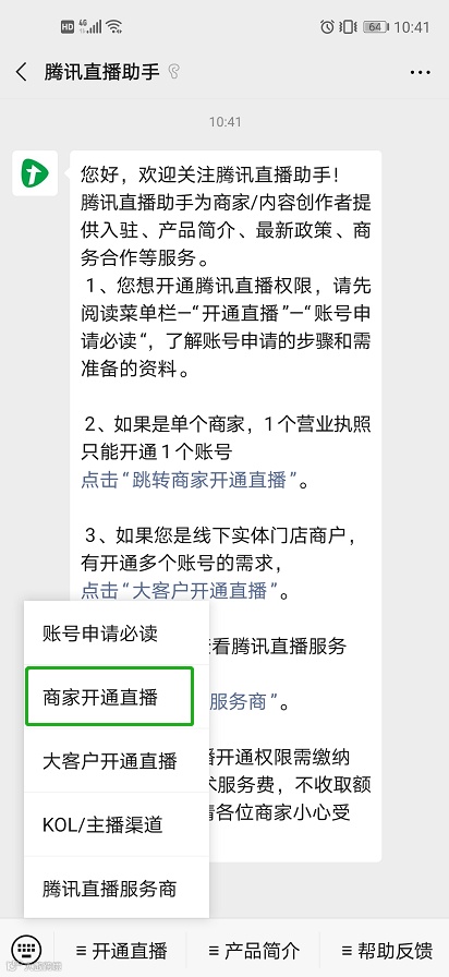 2.还未拥有开播权限的用户可以在本公众号底部菜单栏-开通直播-“商家开通直播”申请开播权限,或者直接点击“阅读原文”申请开播权限。