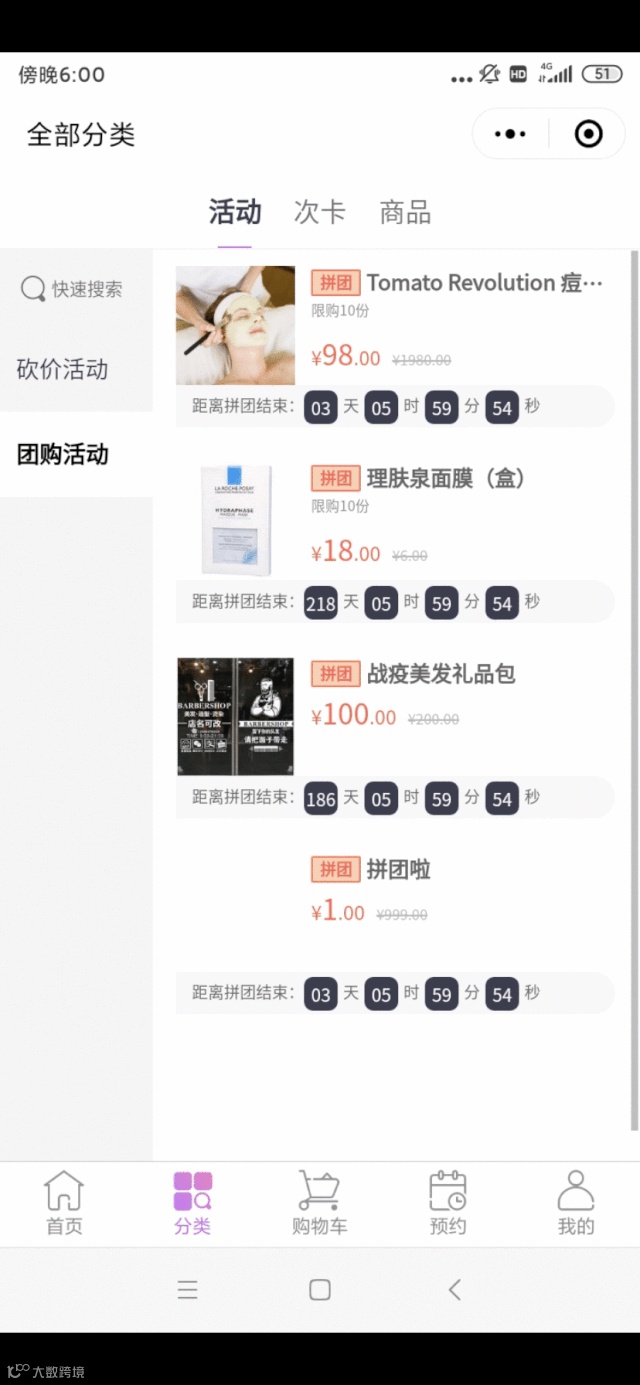 可针对此类型需求的顾客,在小程序商城平台设置相关清洁护理项目参与团购、拼团、限时打折等促销活动。给顾客一种:”现在活动力度最大,不马上抢购商品就真的亏大了的感觉“。