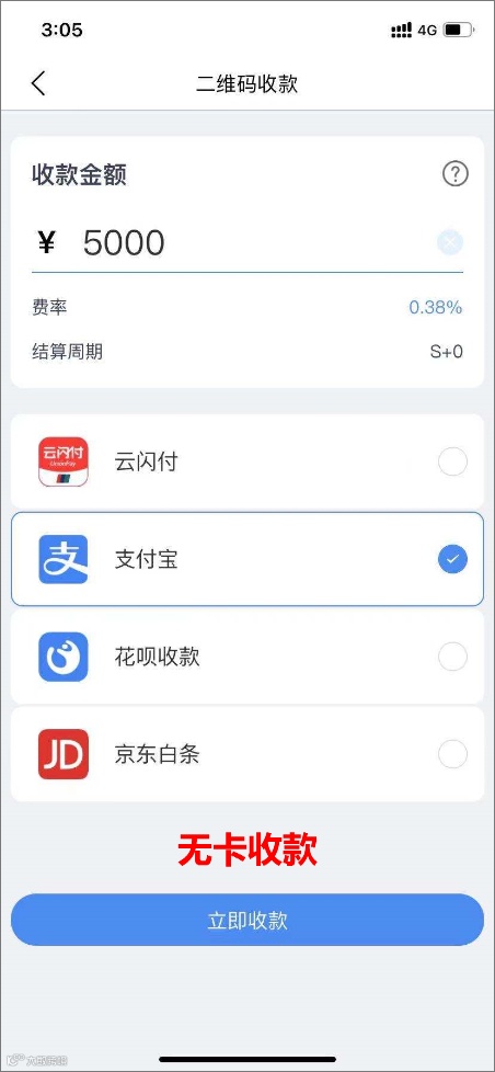 无卡收款:支持多种无卡收款,包含云闪付、京东白条、支付宝、花呗收款,以及花呗分期