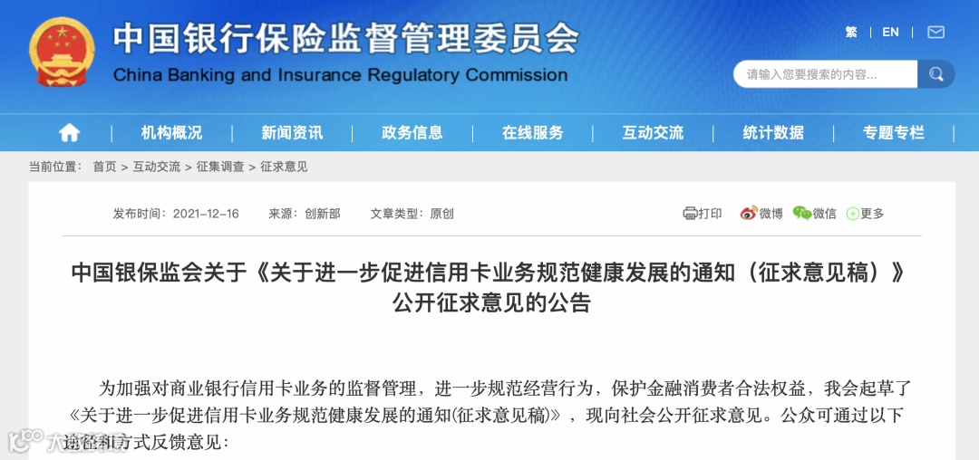中国银保监会关于《关于进一步促进信用卡业务规范健康发展的通知(征求意见稿)》公开征求意见的公告