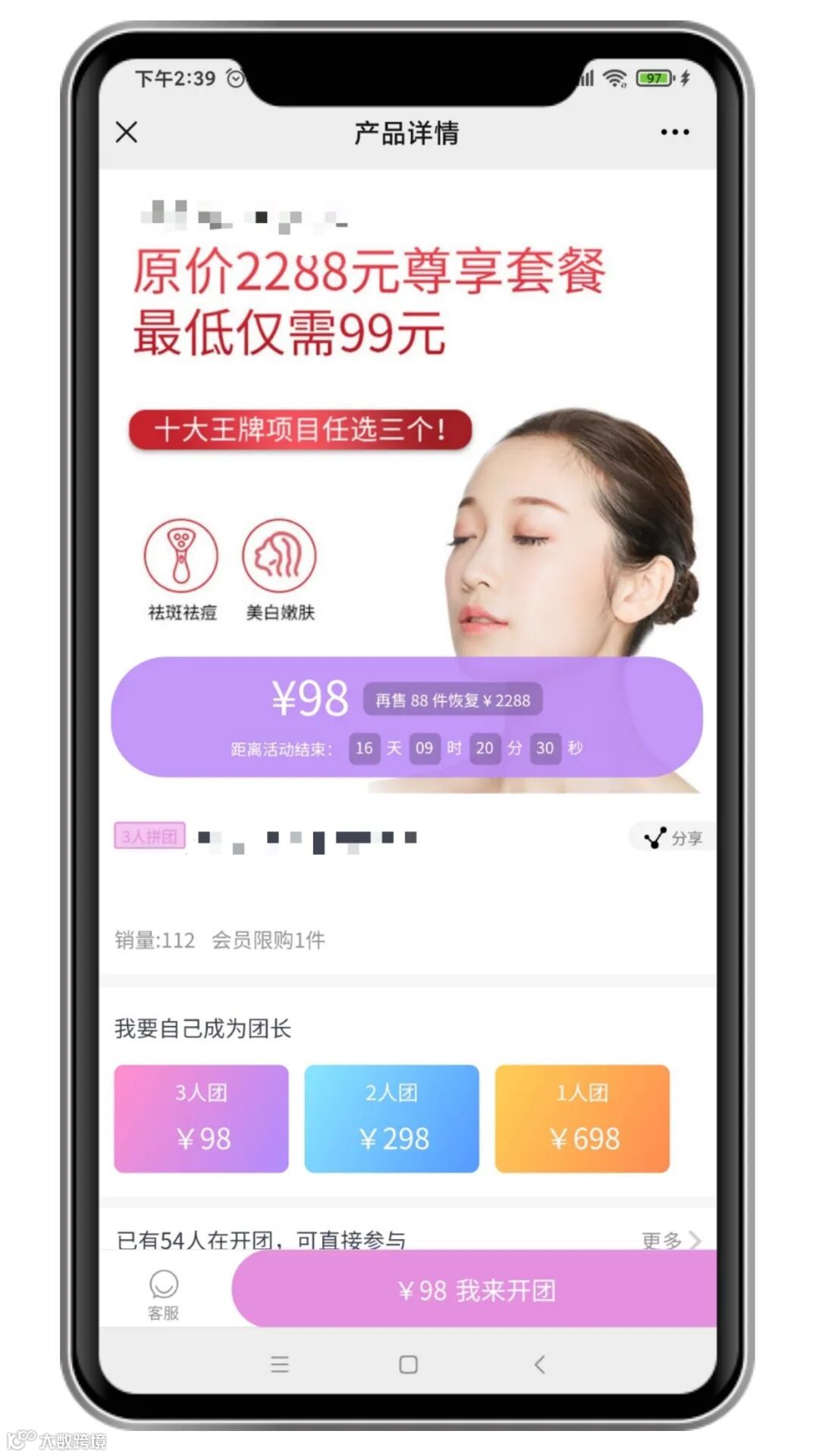 银豹美业拼团功能,用多项服务次卡吸引陌生顾客进行低价拼团。