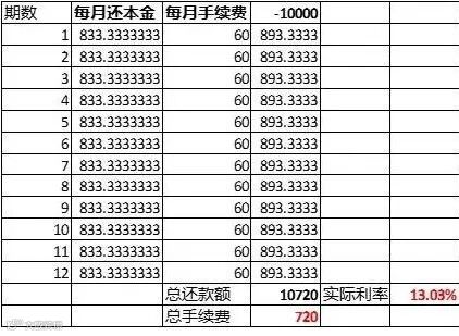 (10000+9167+8334+7501+……+1670+837)除以12个月=5419元,而分期的实际年利率就是总利息720元/5419元=13.28%,你没看错,这就是信用卡分期的实际利率,整整高了一倍多!