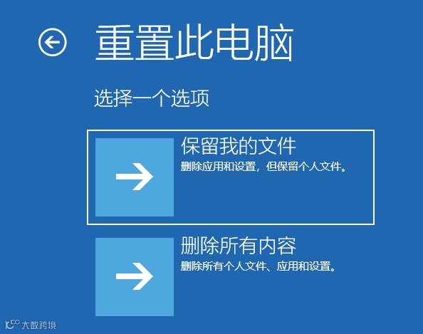 重置此电脑选项允许你选择保留我的文件或删除所有内容,在以下界面中,可以根据自身的实际情况进行选择。