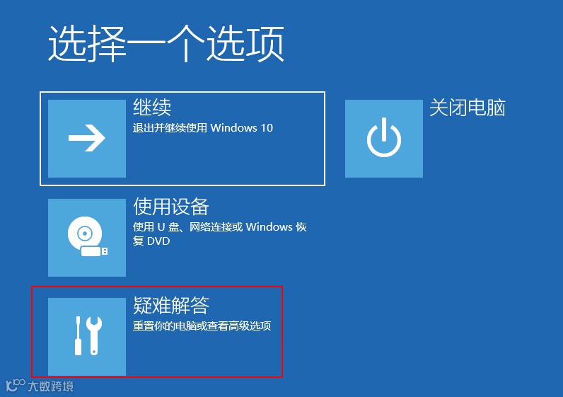 下一步,在接下来进入的选择一个选项界面中,选择下方的疑难解答。
