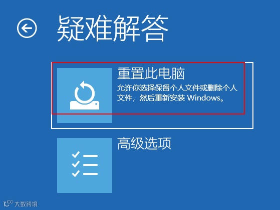 在疑难解答界面中,选择重置此电脑。