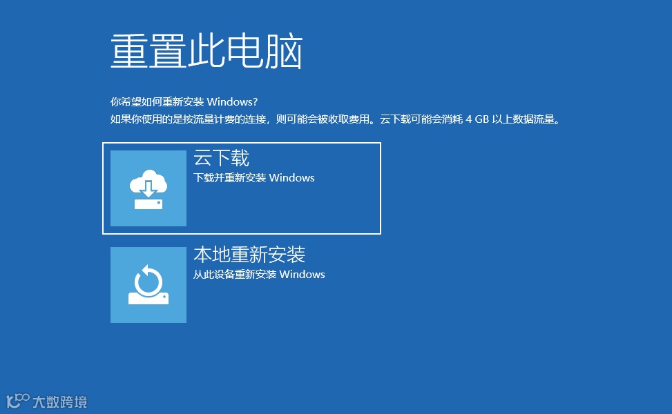 接下来同样有两个选项可以选择,云下载(下载并重装安装 Windows)和本地重新安装(从此设备重新安装 Windows),需要注意的是云下载可能会消耗4GB以上数据流量,选择云下载即可。