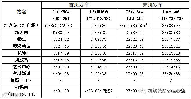 机场城际初期运营时间为6:00至23:00,运营服务17小时,上线列车8列,行车间隔9分43秒,从北客站(北广场)至机场西(T1、T2、T3)需33分钟。