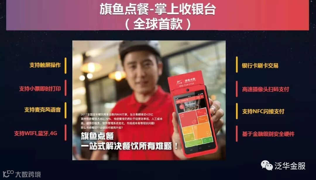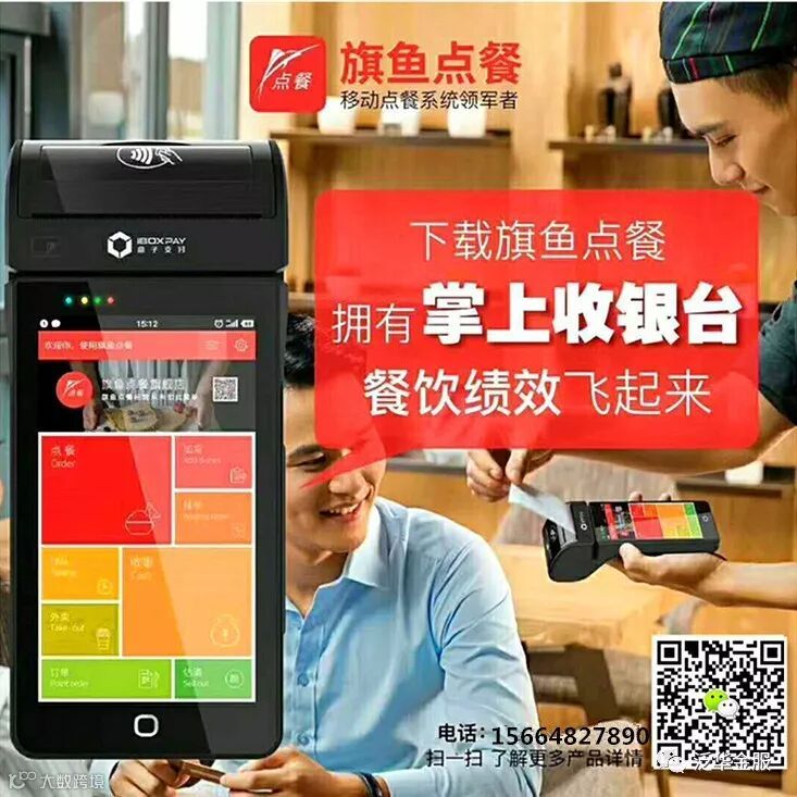 4、旗鱼战略级合作伙伴盒子科技智能慧POS一元购,完美搭载运行旗鱼点餐软件。