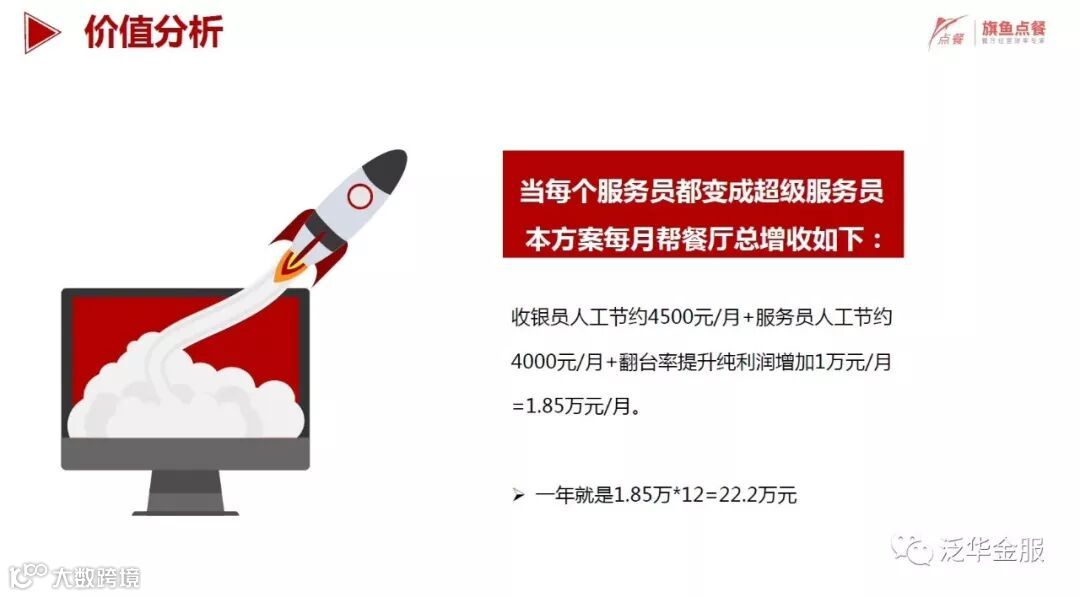 旗鱼点餐从智能点餐SaaS切入,为商家搭建互联网经营场景,提供大数据挖掘和分析服务。区别于普通餐饮软件提供简单的下单功能,旗鱼点餐系统将打造智能的互联网点餐系统,未来会基于平台沉淀的数据打造餐饮大数据云计算平台,减少商家经营成本,提高经营效率,帮助商家一站式接入互联网。