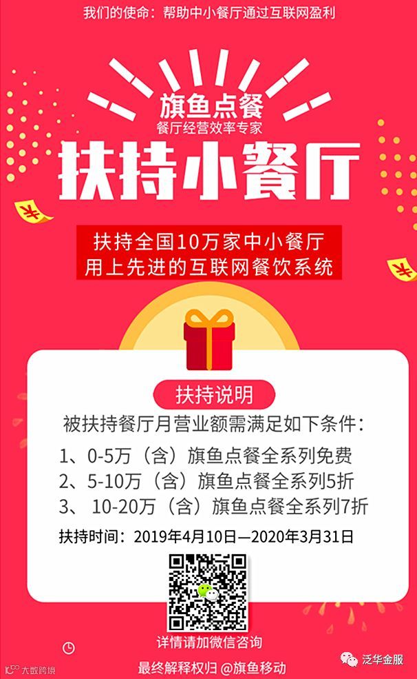 即日起,旗鱼点餐将通过3年时间,以全系列产品《旗鱼点餐系统-餐厅经营效率专家》,《吃耶小程序餐厅-餐厅客流专家》,免费扶持100万家中小餐厅,协助提高他们互联网意识,改善经营效率,帮助他们赚钱发展,同时完成我们旗鱼点餐发展初级阶段的使命。