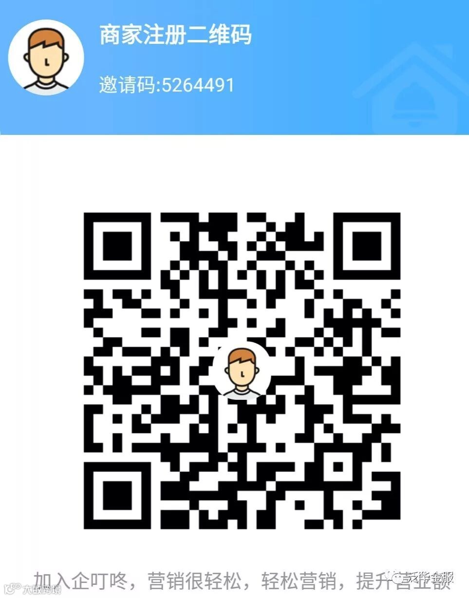 8.任何行业都可以无缝对接(餐饮,美容,养生,房地产,建材,超市,保险,广告,旅游,娱乐,教育,培训,酒店,直销,微商……☞更多落地营销实战案例关注公众号《企叮咚商业联盟》,扫码注册: