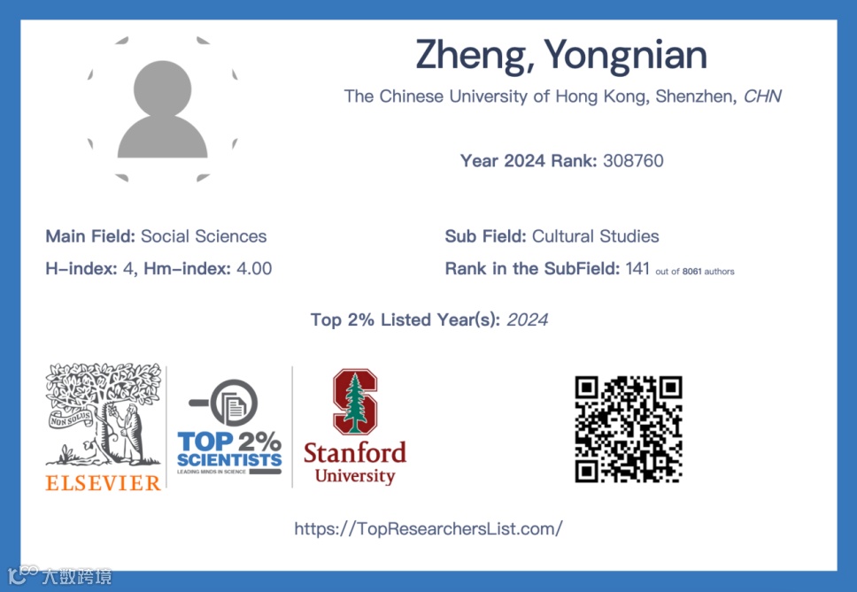 郑永年教授入选全球前2%顶尖科学家榜单