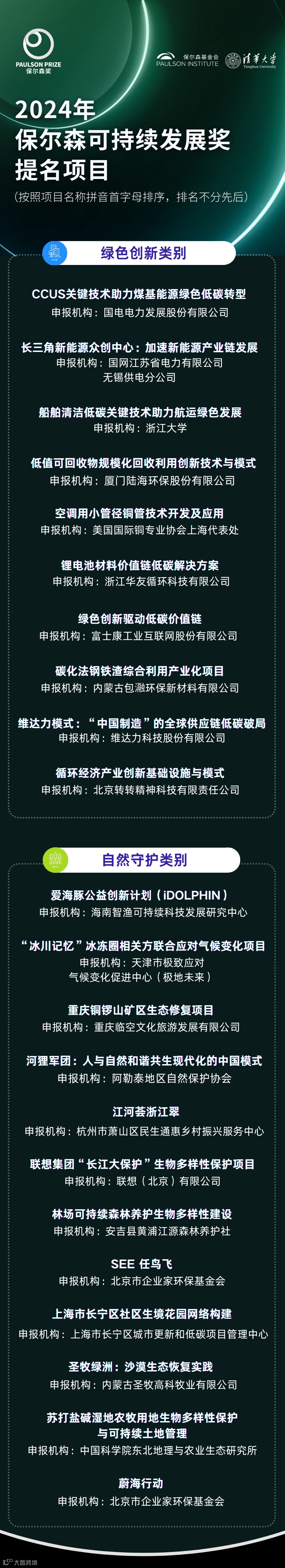 今日,保尔森基金会和清华大学正式公布2024年度“保尔森可持续发展奖”(简称:“保尔森奖”)进入绿色创新类别和自然守护类别的提名项目。由深圳市国际交流合作基金会支持的“保尔森奖”每年举办一届,旨在表彰中国境内具有创新性、可复制性、兼具经济和环境双重效益的解决方案,以助力应对全球最为紧迫的气候和生物多样性挑战。自2013年创立以来,“保尔森奖”为推动全球向净零排放转型、开创自然向好的未来发挥着独特的引领作用。