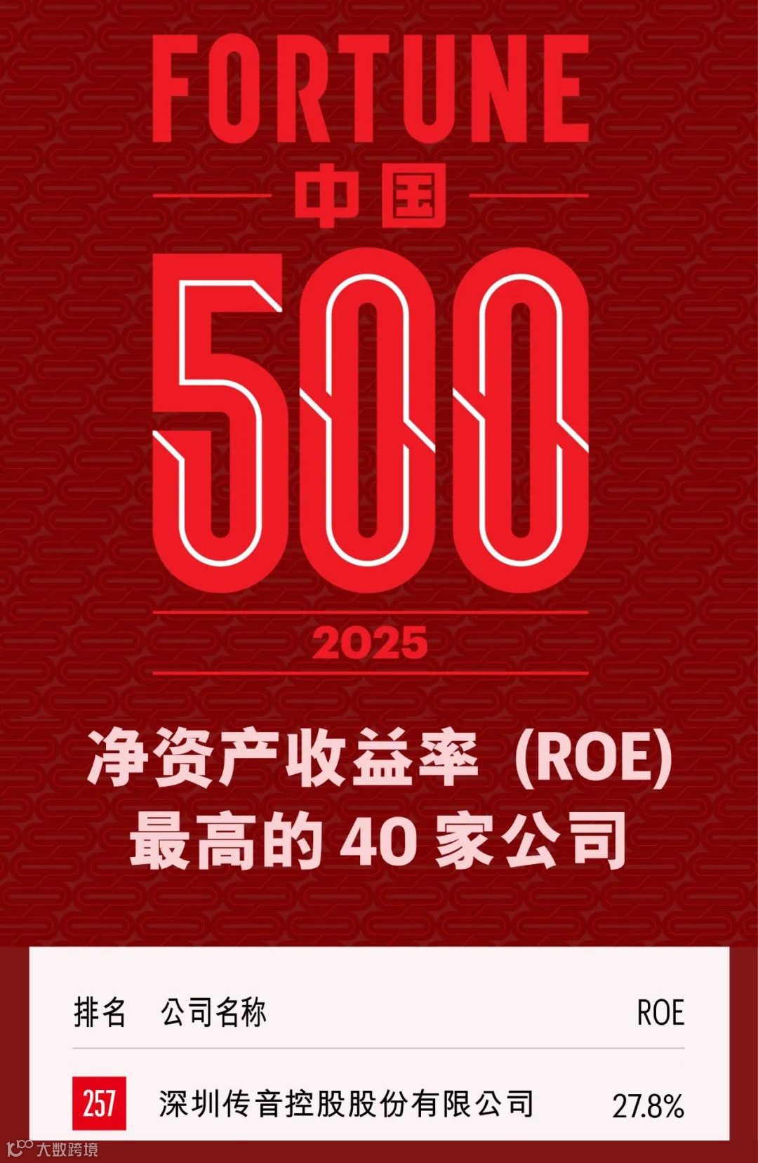 7月22日,2025年《财富》中国500强榜单正式发布。传音控股凭借稳健的增长态势和强大的全球竞争力,连续6年上榜《财富》中国500强,位列榜单第257名,较去年上升32名。在同期发布的《财富》中国500强净资产收益率(ROE)榜单中,传音位列第14位,展现了优异的盈利能力和企业运营质量。