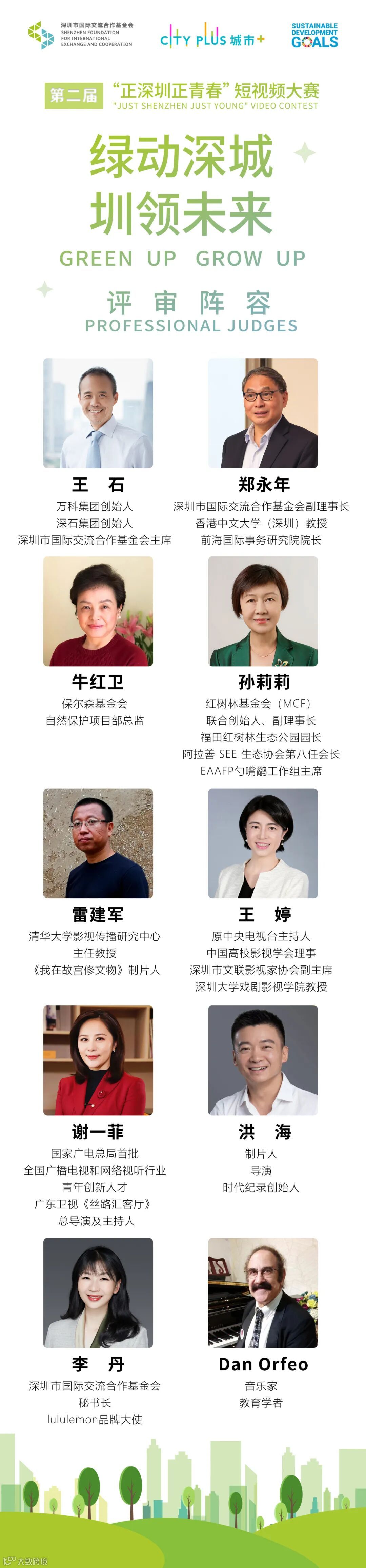 本届大赛诚邀10位不同领域大咖作为评审。大咖评审们在遴选过程中,将更多地从投稿作品的主题性、思考力、表现力综合考量作品。评审团将坚持一定的视频制作标准和高度要求,同时为能够充分呈现深圳绿色健康发展、包容多元文化的参赛选手,提供专业和广泛的指导意见和建议(上干货啦~)