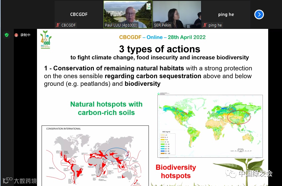4月28日,中国生物多样性保护与绿色发展基金会/大气治理与低碳发展工作委员会成功举办以“法国千分之四土壤固碳计划及中国如何参与”为主题的线上研讨会。此次会议主要目的是介绍“法国千分之四土壤固碳计划”,交流目前国内外在土壤固碳方面的研究和实践经验,探讨“双碳”目标提出后中法在土壤固碳方面合作的机会。