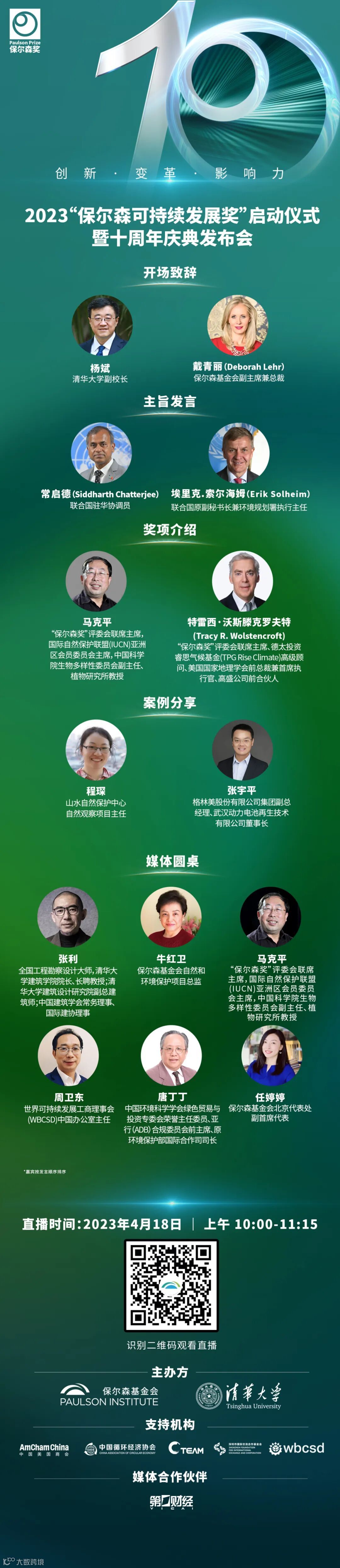 保尔森基金会和清华大学拟于4月18日(周二)共同主办2023“保尔森可持续发展奖”(简称“保尔森奖”)启动仪式暨十周年庆典发布会,面向可持续发展领域的相关企业和机构发布奖项申报信息,正式启动本年度申报工作。