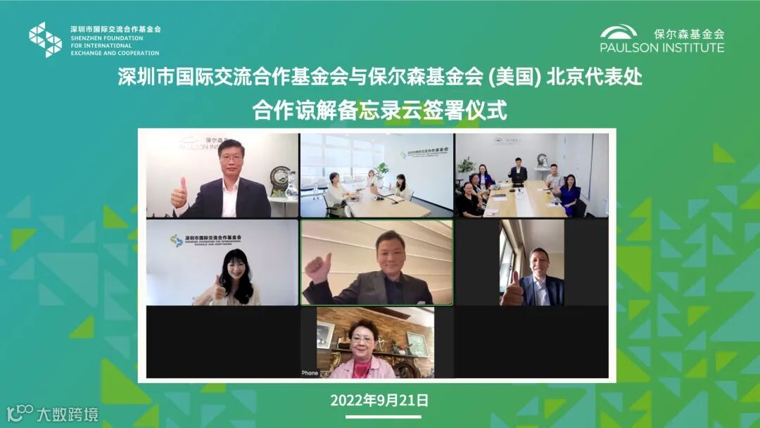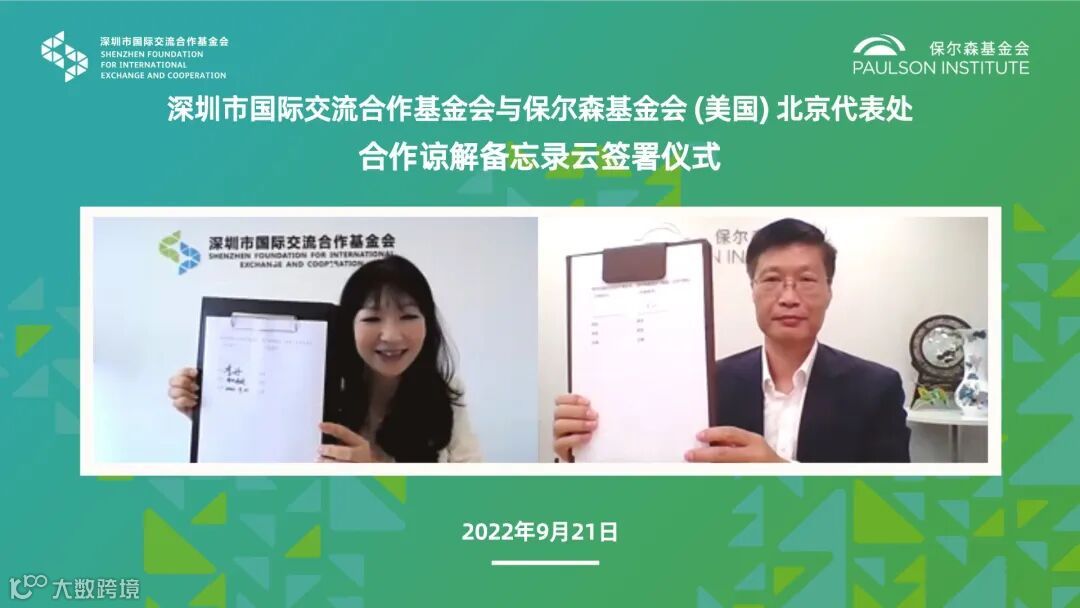 9月21日,深圳市国际交流合作基金会与保尔森基金会(美国)北京代表处合作谅解备忘录云签署仪式举行。深圳市国际交流合作基金会秘书长李丹和保尔森基金会(美国)北京代表处首席代表于江分别代表双方签署合作备忘录,为在推动绿色低碳、生态保护、可持续发展等领域的民间交流与合作开启新的篇章。