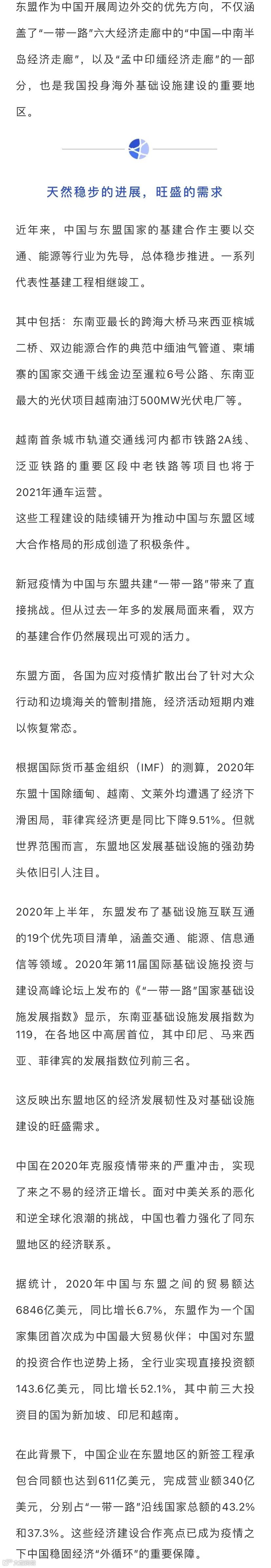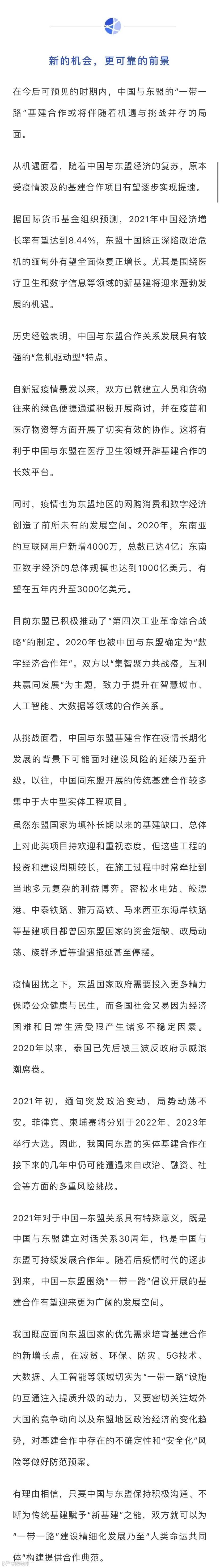 “2021年对于中国—东盟关系具有特殊意义,既是中国与东盟建立对话关系30周年,也是中国与东盟可持续发展合作年。” 2020年突然爆发的全球新冠疫情为中国与东盟的合作带来直接的冲击。本篇文章介绍了在新冠疫情的背景下,中国与东盟方面合作的新突破,并展望中国与东盟的“一带一路”基建合作未来将面临的机遇与挑战。