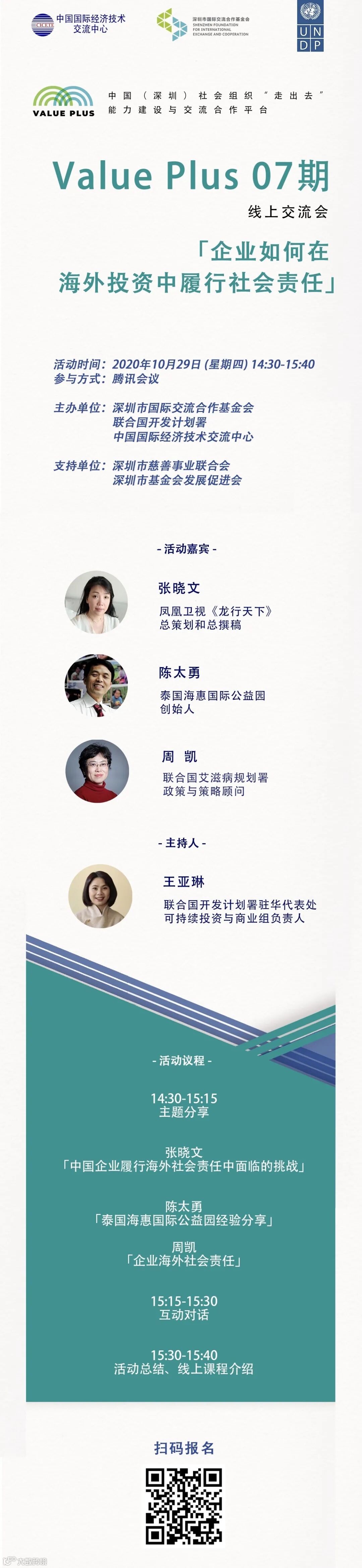 Value Plus 中国(深圳)社会组织“走出去”能力建设与交流合作平台,将于10月29日举行第七期线上交流会,携手来自凤凰卫视《龙行天下》、泰国海惠国际公益园和联合国艾滋病规划署的专家,共同探讨企业如何在海外投资中履行社会责任。