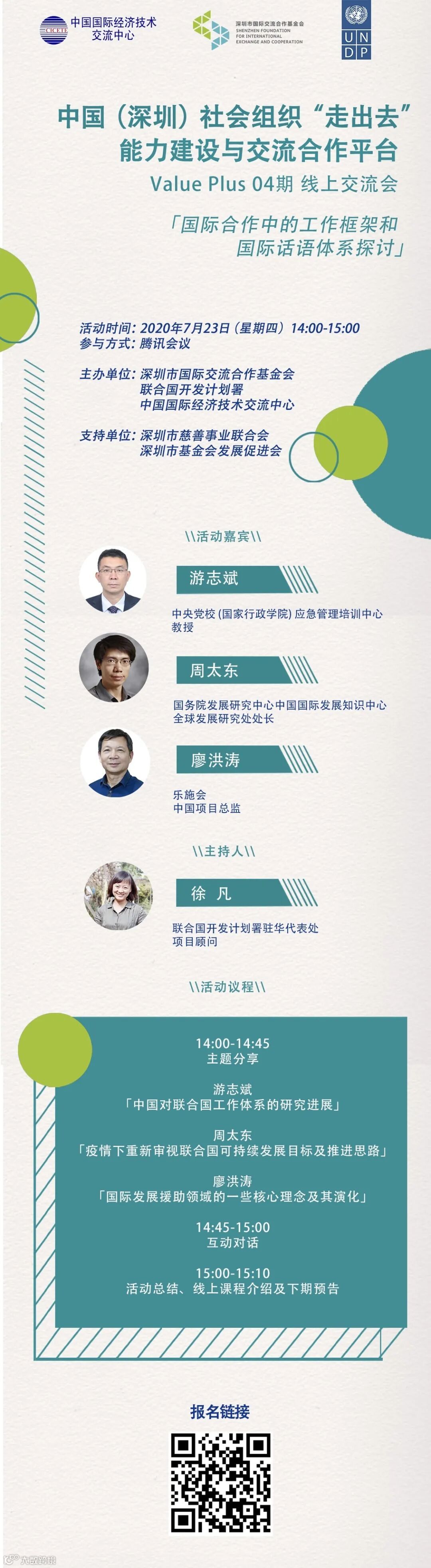中国(深圳)社会组织“走出去”能力建设与交流合作平台(Value Plus),将于7月23日举行第四期线上交流会,携手来自中央党校(国家行政学院)、中国国际发展知识中心以及乐施会的专家,共同探讨国际合作中的主要工作框架和国际话语体系。