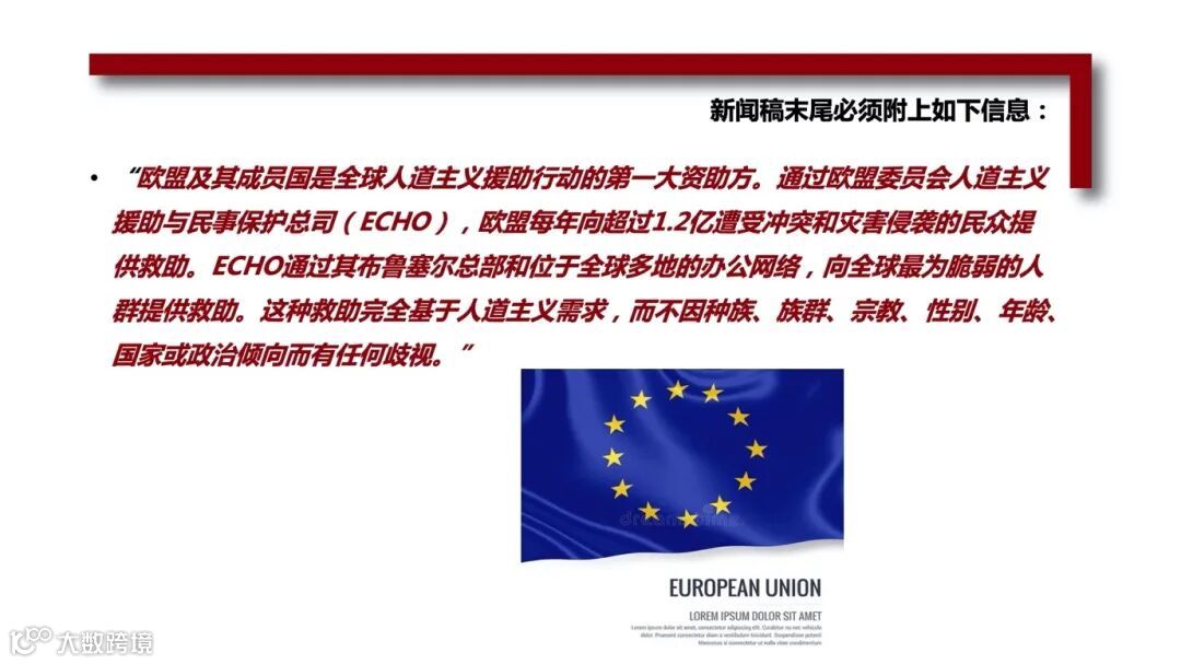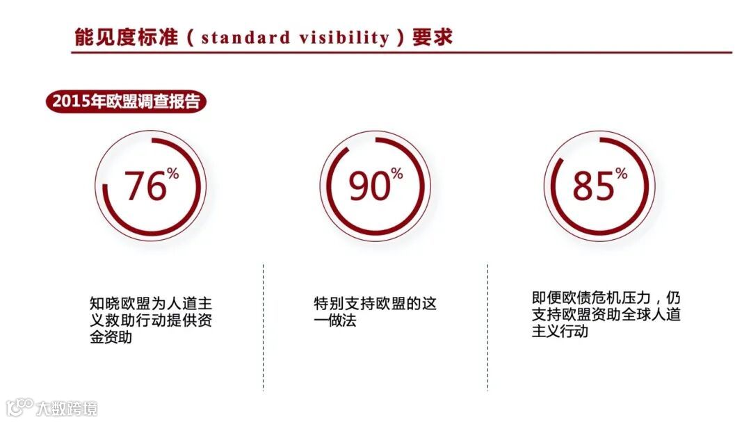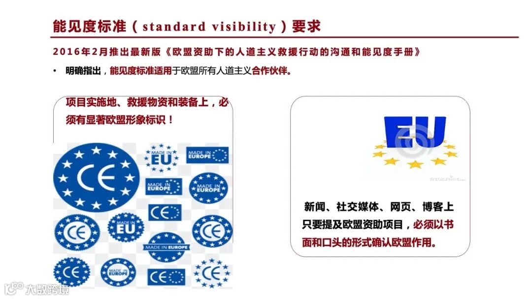 最后一点是它的能见度标准要求,这个能见度标准要求我觉得很有意思,我们可以参考一下。欧盟要求所有跟它合作的国际非政府组织在项目运作的实施地、在救援物资上、在装备上必须要印出显著的欧盟形象标识,欧盟的logo,像右侧的这些。在你发布的新闻稿当中,所有的新闻无论是社交媒体的、网页上的、博客上的、还是电视的,所有你发布的新闻稿件或者接受的相关采访都必须要以书面或者是口头的形式来确认欧盟在其中的作用。