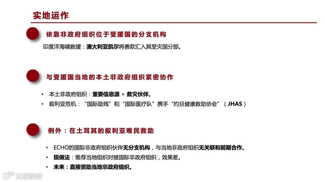 那么我要说一个例外在这个地方,还是在叙利亚难民救助的过程当中出现了一个例外,就是在土耳其。ECHO发现它的国际非政府组织的伙伴在当地没有分支机构,基本上没有找到分支机构。同时它与当地的非政府组织也没有前期的合作,所以面对这种情况ECHO就选择,寻找和推荐当地的一些非政府组织直接对接ECHO的国际非政府组织的伙伴,但是结果这个项目运作的效果非常差。所以最后ECHO就决定,未来如果还是出现类似这样的一种国际非政府组织没有分支机构、没有当地合作伙伴的情况下,那么它们会直接把资金交付给当地运作良好的、历史悠久的非政府组织来进行直接的运作,这是ECHO未来的一个决定。