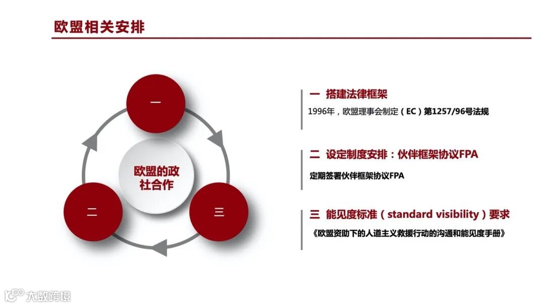 第三部分,我要谈一下政社合作。还是以欧盟的ECHO为例,我们知道ECHO向全球的人道主义行动提供了大量的资金,但是对于国际非政府组织人道主义的伙伴来说,它实际上设定了非常严格的法律框架,还有非常非常细致的制度安排,同时还有一个能见度标准的要求。那么我从这三个方面再简单的说一下。