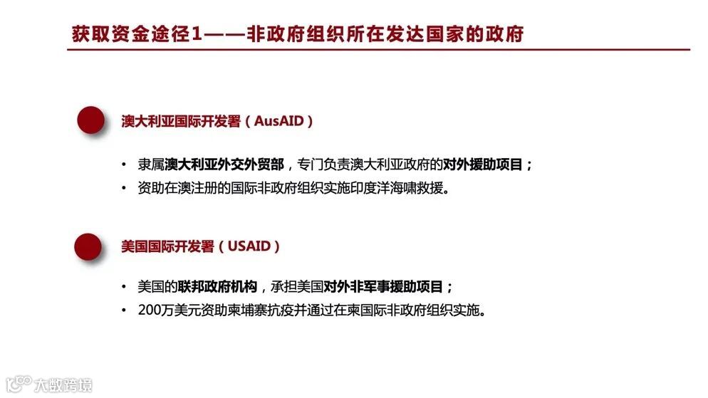 具体来看,从获取资金的第一个途径是发达国家的政府,我们有两个例子,一个是澳大利亚国际开发署AusAID,还有美国国际开发署USAID。这两个机构都是分别在这两个国家专门负责与在他们国家注册的国际非政府组织进行对接,拨付资金供这些非政府组织进行全球的人道主义救助。