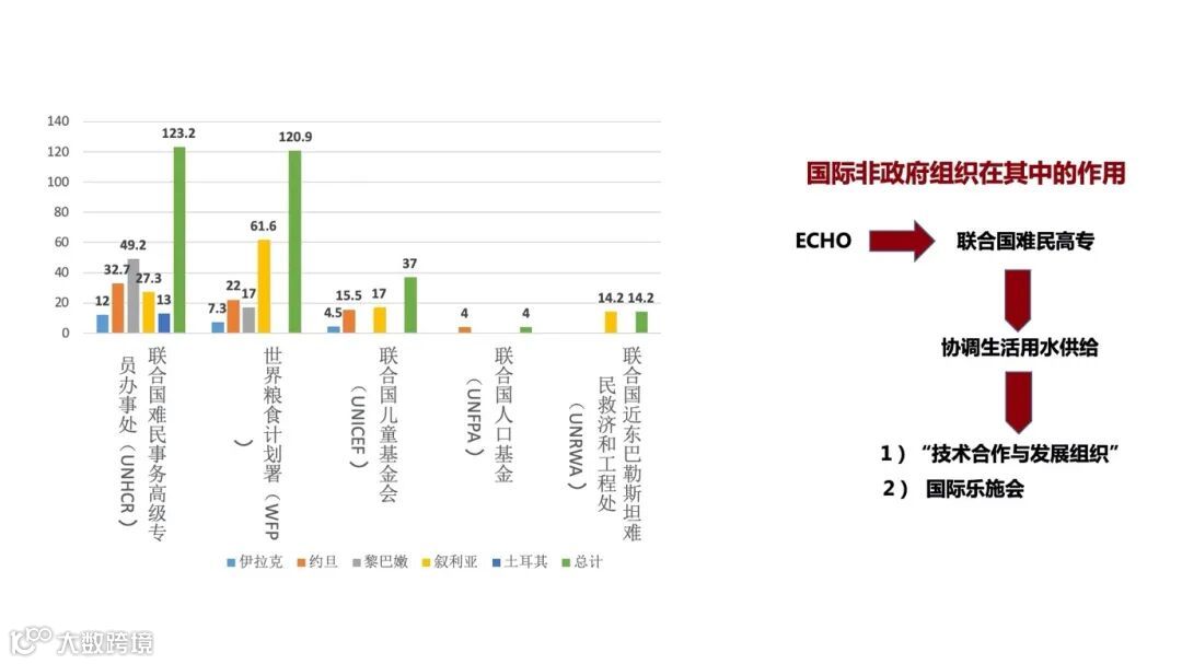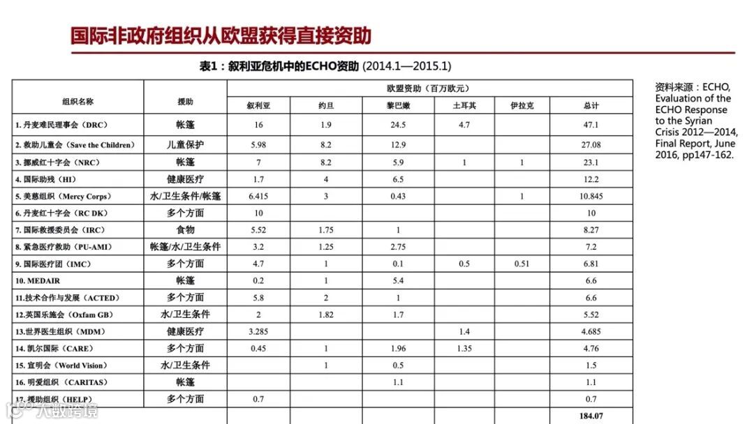 我们看下两张图表里面是叙利亚危机当中ECHO在2014年到2015年对国际非政府组织的资助,我们看到右下角的这个地方是它的资助的金额1.84亿欧元,左边是获得资助的非政府组织,我们比较熟悉的比如说救助儿童会、比如说英国乐施会等。