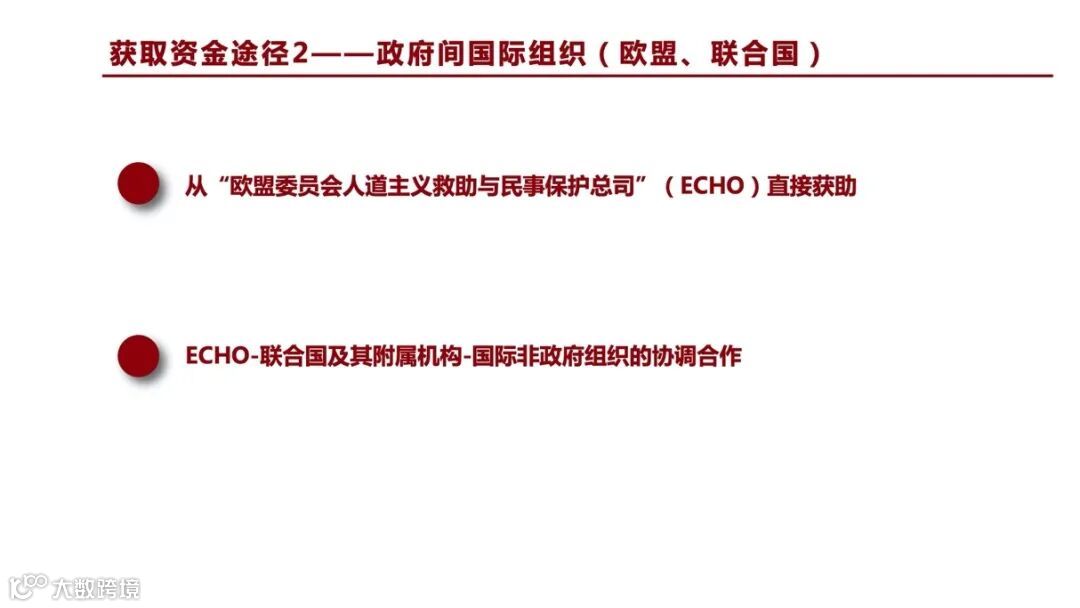 获取资金的第二个途径是政府间的国际组织,主要的是联合国和欧盟。以欧盟为例,欧盟与国际非政府组织对接的枢纽结构就是我们说的欧盟委员会人道主义救助与民事保护总司,以下简称ECHO。ECHO一般是直接向国际非政府组织拨付资金,当然ECHO也经常与联合国的附属机构合作,一起与国际非政府组织协调它们在实地的人道主义救援行动。