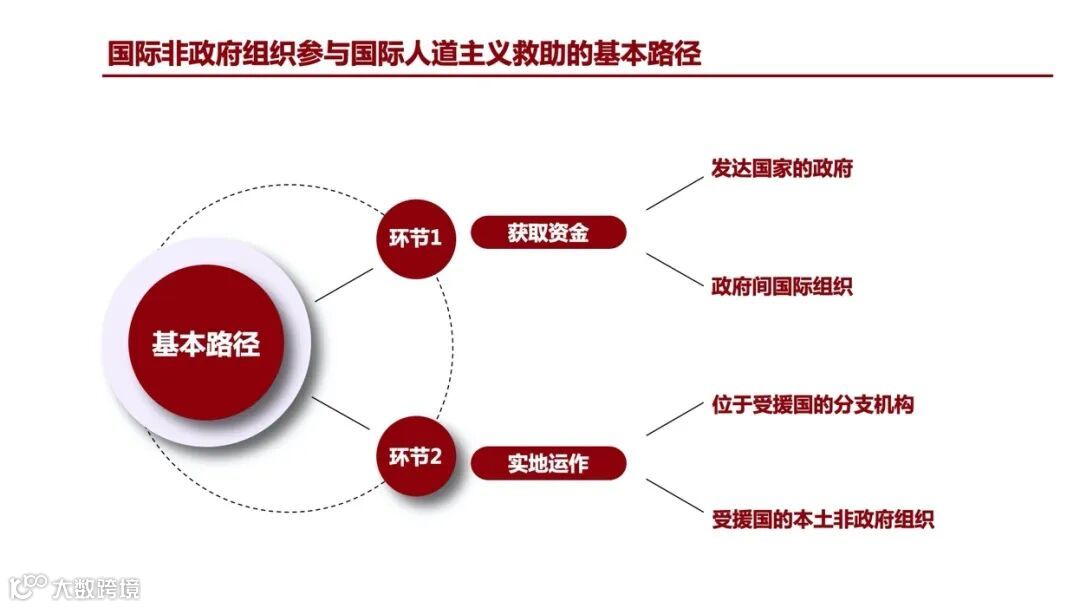 第二个部分是国际非政府组织参与国际人道主义救助的基本路径。这个路径其实很简单,就是两个环节:一个是获取资金,一个是实地运作。