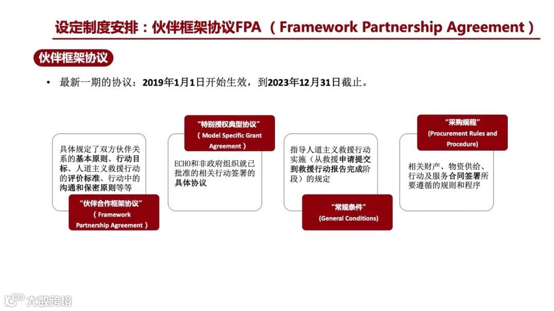 那么选取了这些有资质的国际非政府组织之后,你还不能直接进入下面的运作,必须要签署一个伙伴框架协议叫做FPA,这个框架协议欧盟是每4年要更新一次,实际上就是集中限定国际非政府组织到底要遵循哪些具体的原则、走哪些具体的程序才能真正的执行与欧盟的人道主义行动合作。这个FPA分成四个部分,我不具体说了。