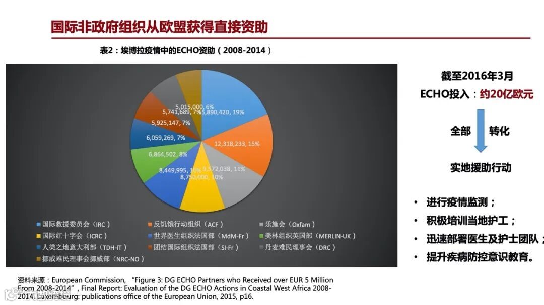 下图是ECHO在埃博拉疫情当中对这些非政府组织的资助,图片下部是非政府组织的名字。数字可能稍微看起来不太清晰,但是我们有一个总的金额,截止到2016年3月ECHO投入的抗疫资金大约有20亿欧元,而且全部转化为国际非政府组织在西非的实地的救援行动,其中包括疫情检测、培训当地护工、调集医疗团队等等。