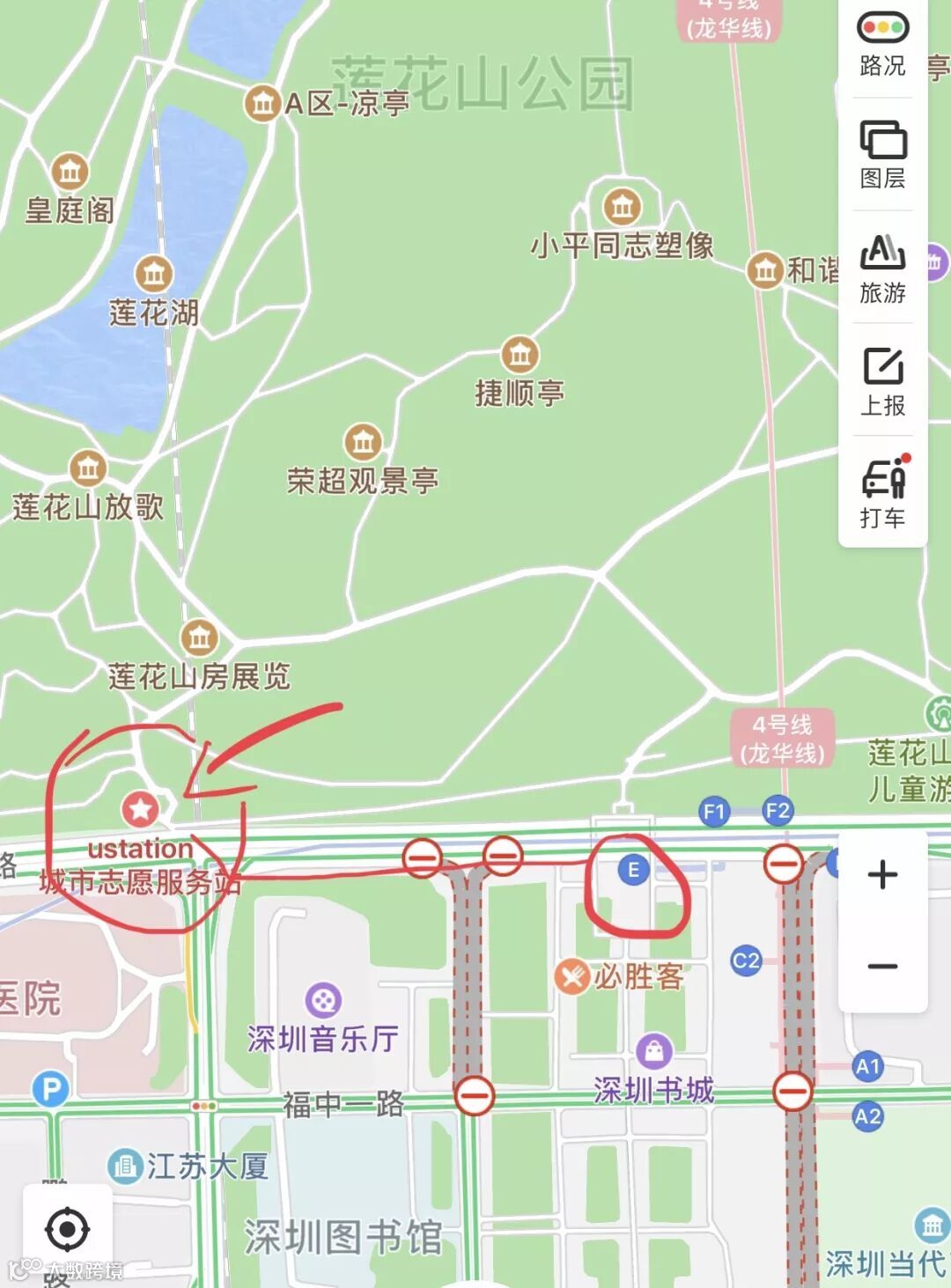 Take the subway from HuaQiang North (华强北) to Children Palace (少年宫). I recommend taking the exit E, going straight ahead, and crossing the towards the LianHuaShan Park (莲花山公园). The U Station is right by the entrance!