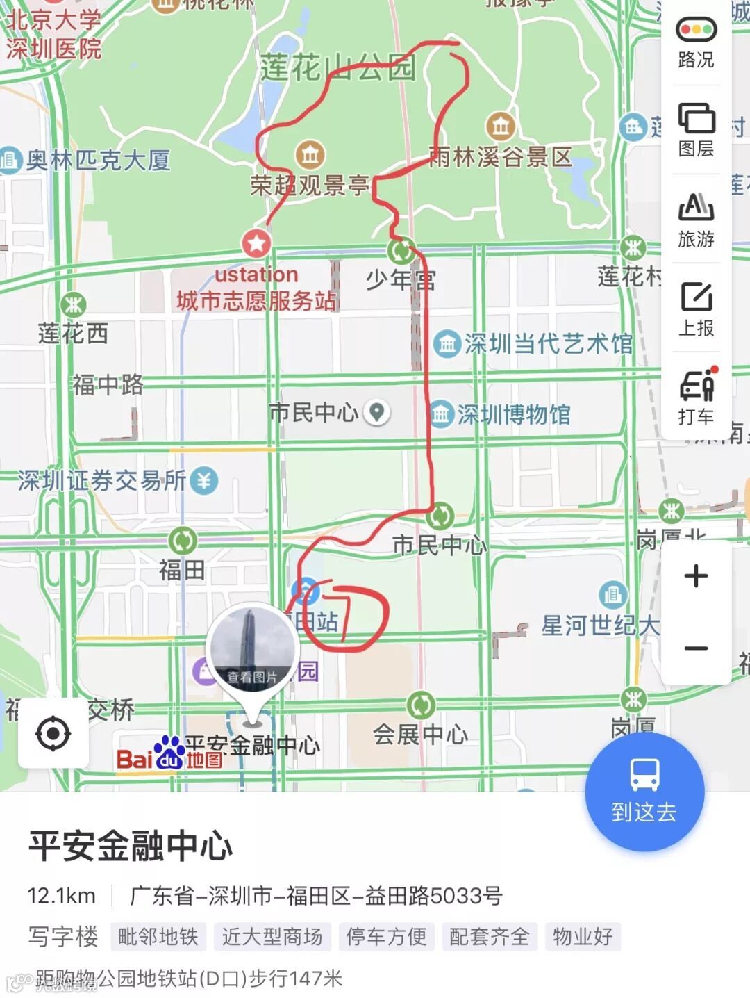 Head down the hill (take a look around) and get a nice walk to the tallest building in Shenzhen, the second tallest building in China and the fourth tallest building in the world, the Ping An International Financial Center (平安金融中心). The best way to get there is to walk through the Futian metro/railway station (takes around 15-20 minutes of walking). Take the exit 7 or 8 and you will be almost under the building.