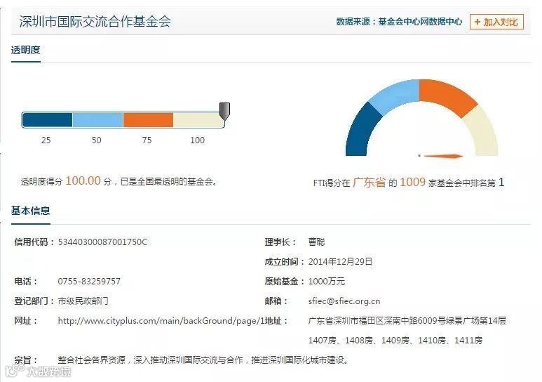 根据基金会中心网的基金会透明指数FTI最新数据,在全国参与评分的6576家基金会中,深圳市国际交流合作基金会以满分100分并列全国第一。