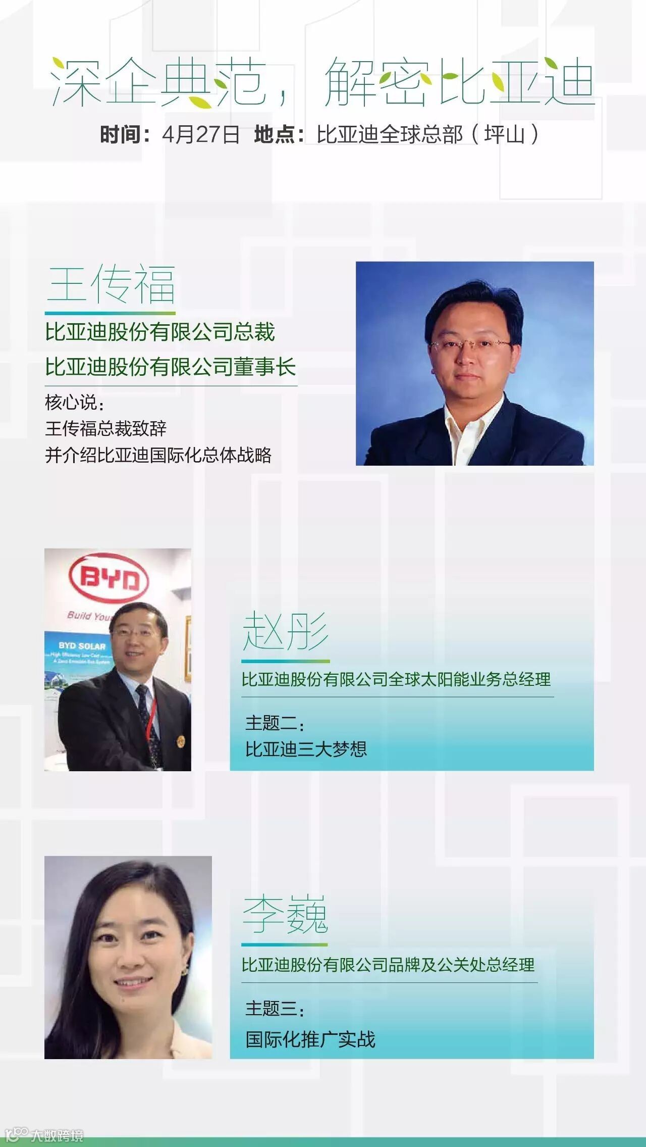 本期实战营指定新能源巨头比亚迪作为营地企业,由总裁王传福先生和两位业务总经理担任大腕导师,亲身分享国际化的战略构想和实践经验,以造梦师的身份倾谈追梦路上酸甜苦辣。