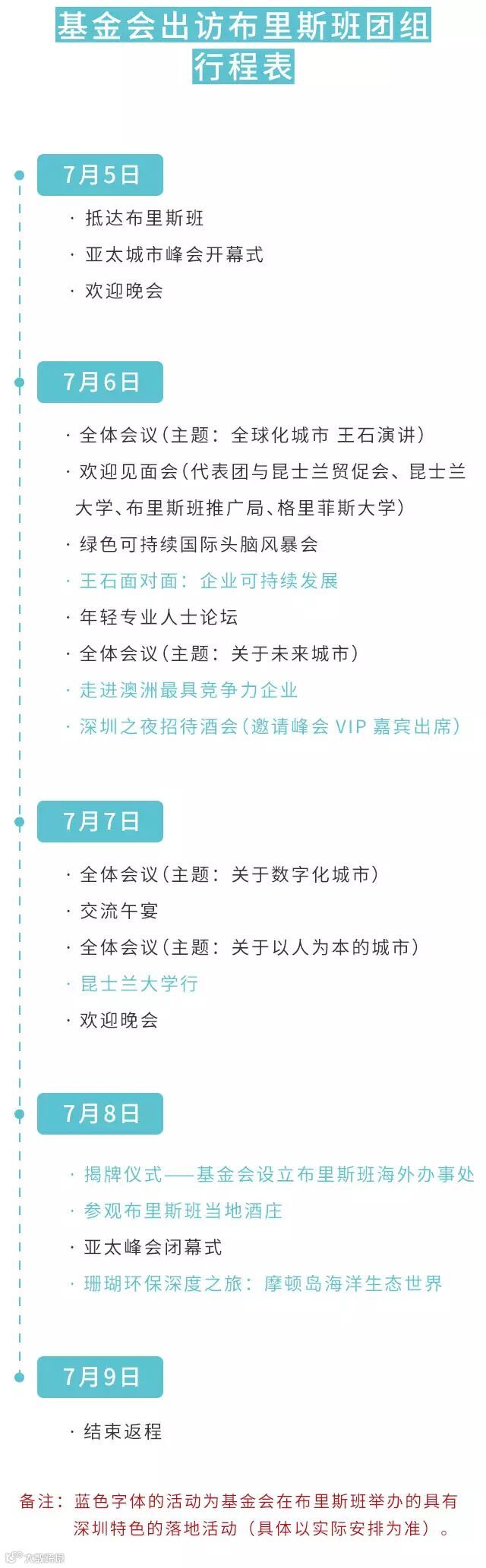 行程中,参团企业不仅可以参加主办方安排的各类重磅级会议,结识来自全球各界的顶级大咖,而且还可参加基金会在布里斯班当地组织的丰富多元的落地活动,如向亚太各市市长展示深圳形象的“深圳之夜”、与当地创新企业和昆士兰大学交流、参观摩顿岛海洋生态保护活动等。