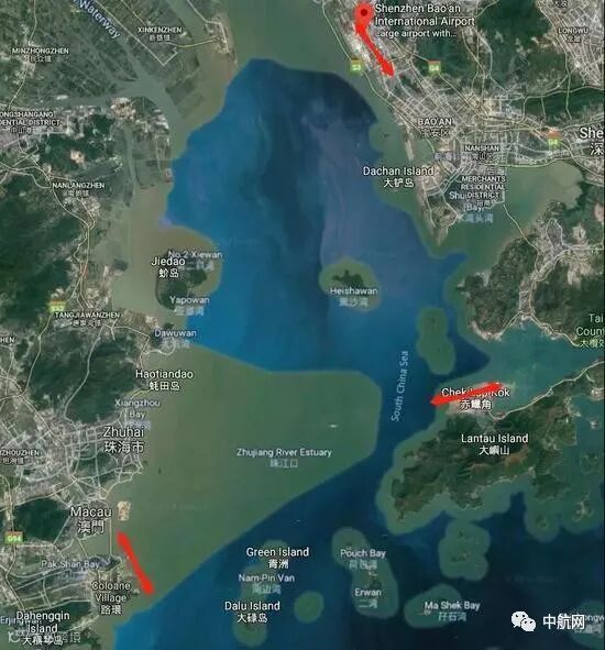 红色为深圳、香港、澳门间机场跑道方向,香港与其他两者垂直