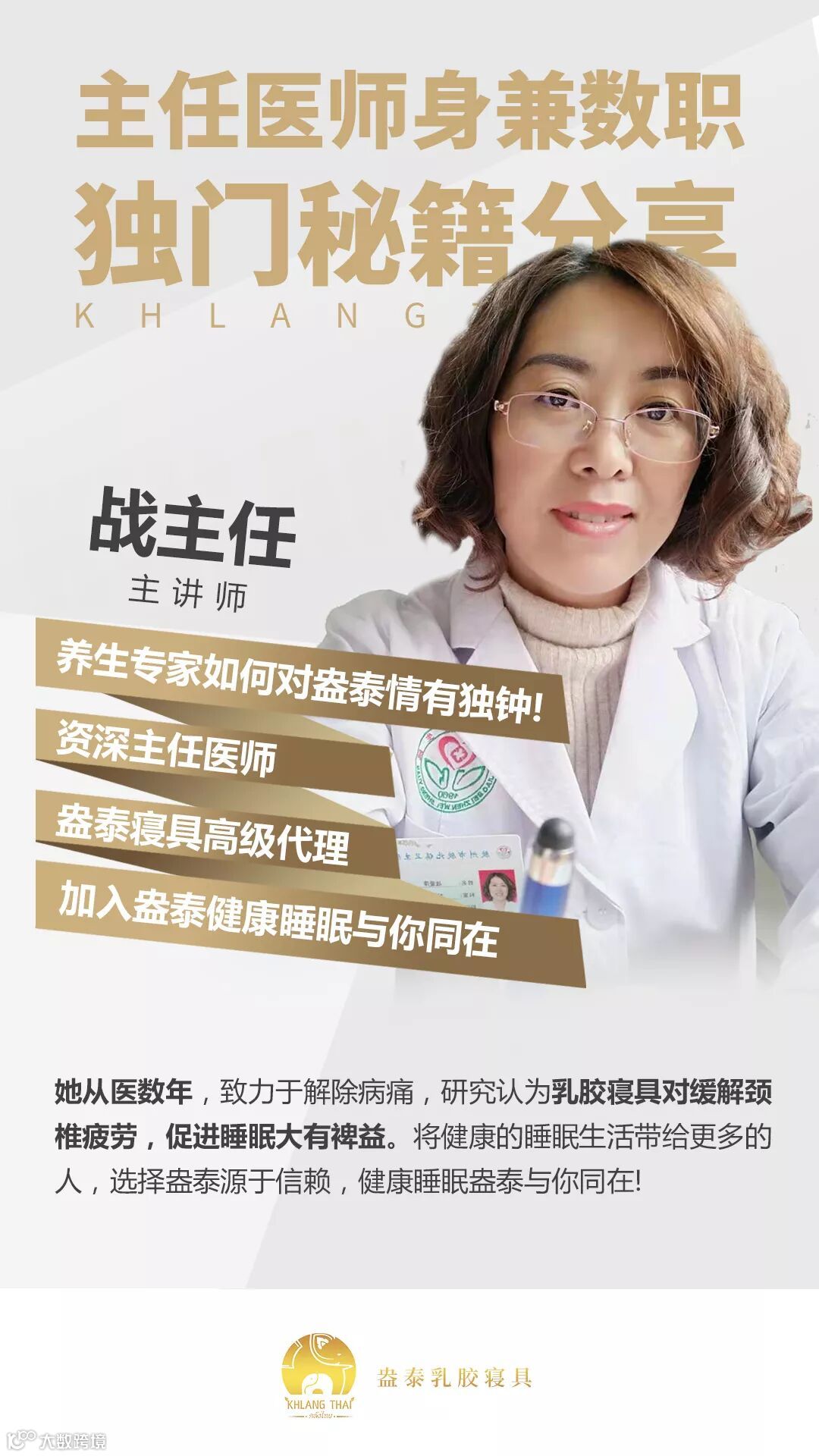 资深主任医师、盎泰乳胶寝具高级代理——战爱萍女士。