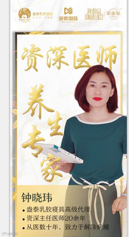 资深主治医师、健康养生专家、盎泰乳胶寝具高级代理——钟晓玮女士。