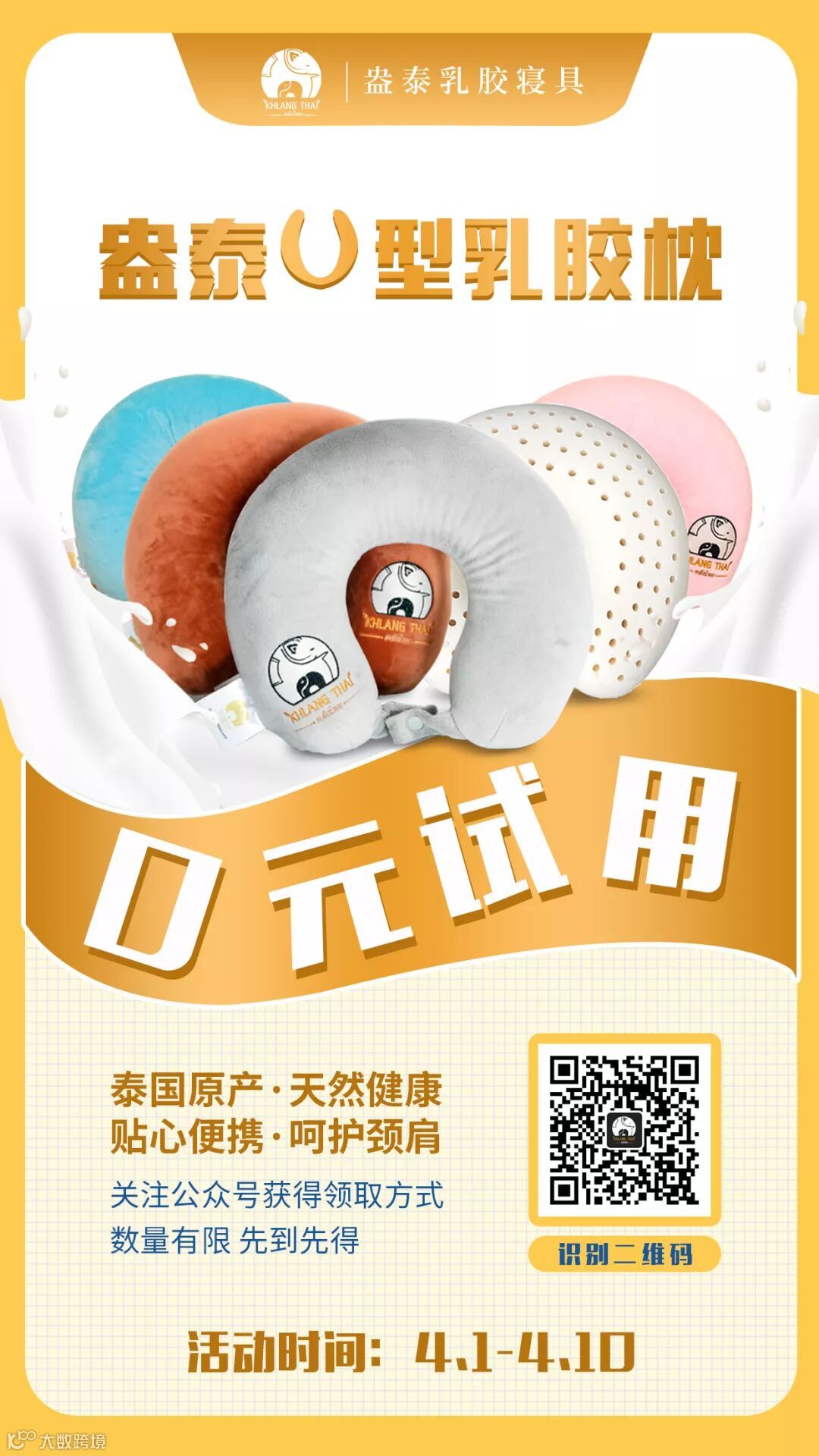 即可获得盎泰乳胶寝具提供给您的价值300元的盎泰乳胶U型枕一个,限量88个,先到先得,机会不容错过!