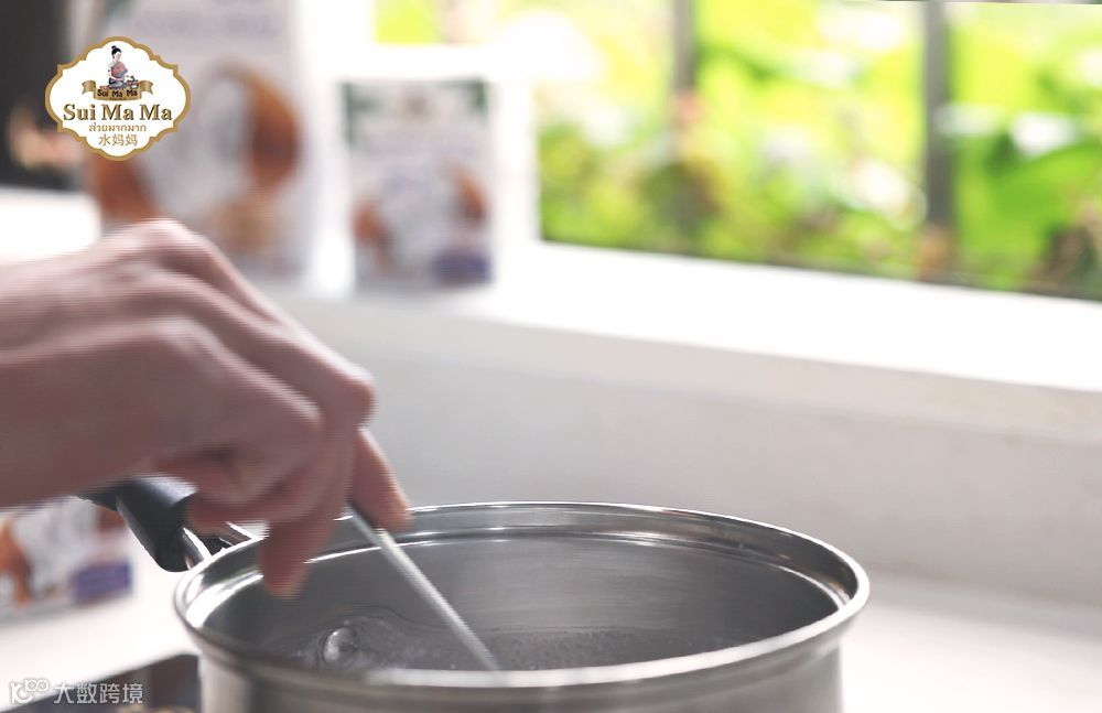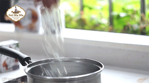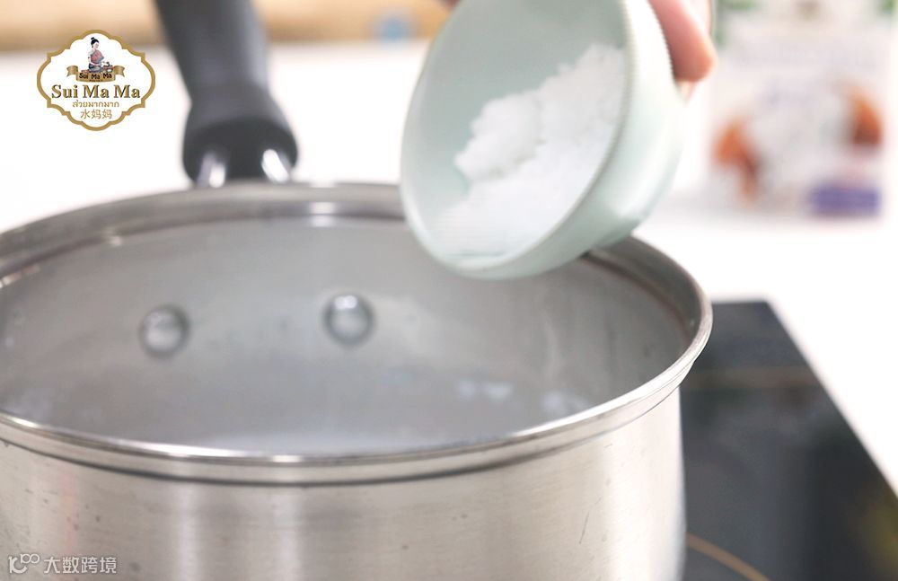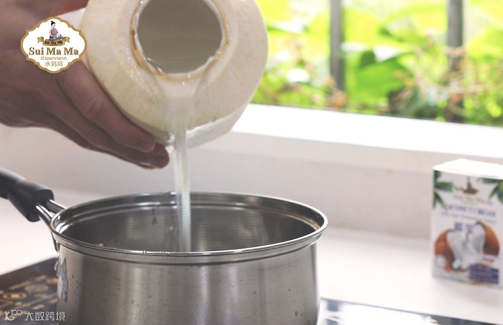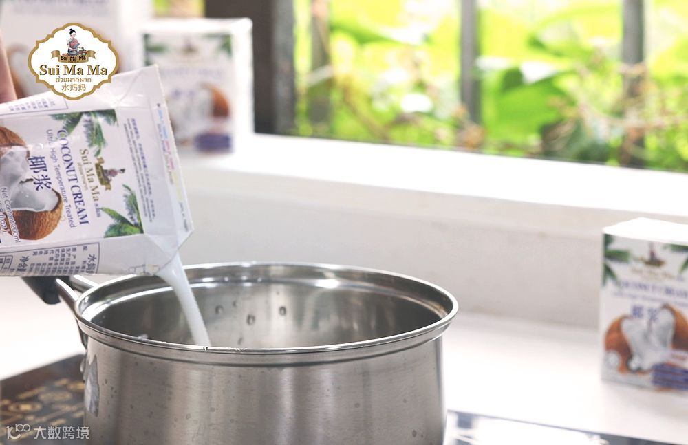3.倒入椰子水、椰浆、糖加热,不必煮开,糖化即可。