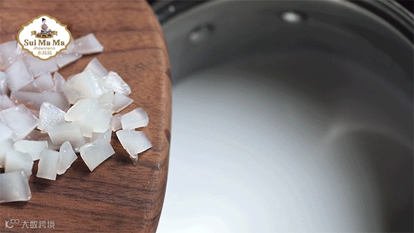 5.糖水海底椰切成小颗粒,并放入锅内.